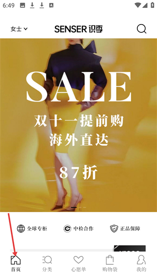 1、首頁(yè)雙十一大促海外直達(dá)87折,有全球?qū)9瘛⒅袡z合作等保障,可選購(gòu)女士時(shí)尚單品,享受正品保障的跨境購(gòu)物服務(wù)。
