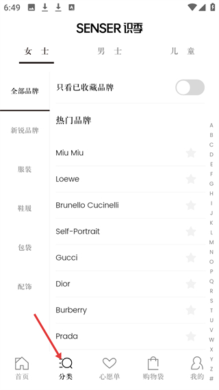 2、分類(lèi)頁(yè)分女士、男士、兒童板塊,熱門(mén)品牌有Miu Miu、Gucci等,可按服裝、鞋履等品類(lèi)查找奢侈品。