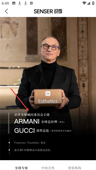 3、品牌保障頁(yè)展示全球顧問(wèn)委員會(huì)主席Francesco Tombolini,曾任ARMANI全球總經(jīng)理、GUCCI銷(xiāo)售總監(jiān),凸顯平臺(tái)奢侈品資源優(yōu)勢(shì)。