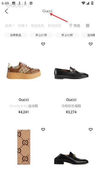 4、Gucci商品頁(yè)展示Chunky B GG運(yùn)動(dòng)鞋、馬銜扣樂(lè)福鞋等,可按品類(lèi)、價(jià)格篩選,享受折扣優(yōu)惠,選購(gòu)正品Gucci奢侈品。
