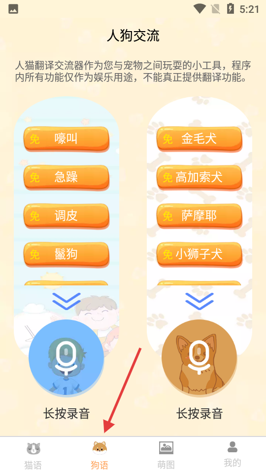 2、人狗交流界面在此,設(shè)有嚎叫、調(diào)皮等狗的情緒表達(dá),以及不同犬種選項(xiàng),長按錄音與狗狗玩耍。