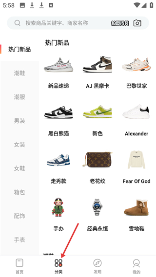 2、分類頁面左側(cè)是潮鞋、潮服等分類,右側(cè)呈現(xiàn)熱門新品,如AJ黑摩卡、老花紋箱包等商品。