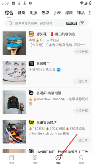 3、發(fā)現(xiàn)頁面可按綜合、鞋類等分類瀏覽,展示源頭鞋廠、毒家鞋廠等商家及相關(guān)鞋服商品支持一鍵分享。