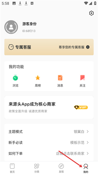 4、我的頁面顯示游客身份信息,有專屬客服入口,含瀏覽、周榜等功能,還可了解成為核心商家等內(nèi)容。