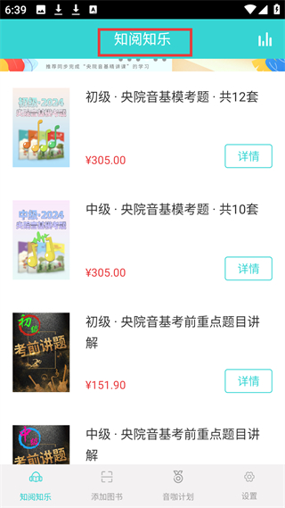 1、知閱知樂板塊,展示初級、中級央院音基??碱}及考前講解課程,用戶可查看詳情,學(xué)習(xí)音樂素養(yǎng)考試內(nèi)容。