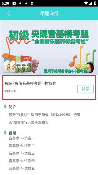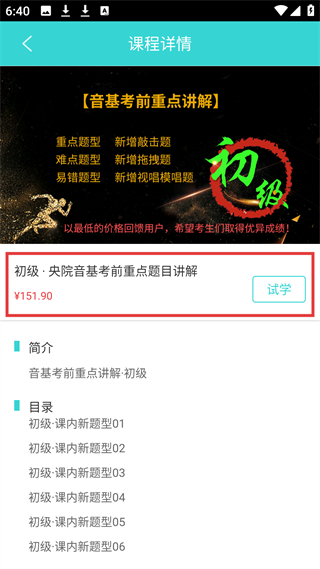 4、初級考前講解詳情,是音基重點題目講解課,有試學(xué)選項,用戶可了解簡介和新題型目錄,學(xué)習(xí)考試重難點。