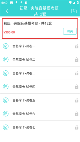 3、初級模考題購買界面,用戶可購買初級央院音基12套??碱},購買后可解鎖試卷內(nèi)容,進行??季毩?xí)。