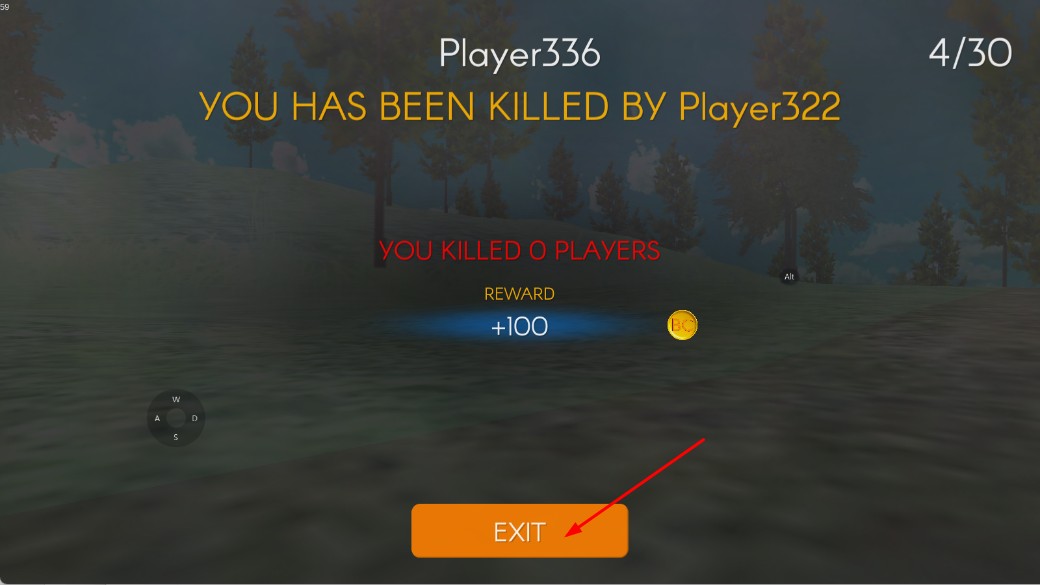 4、若被其他玩家擊敗,會出現(xiàn)顯示被誰擊敗等信息的界面,此時點擊EXIT按鈕,可退出該局游戲,準(zhǔn)備下一次挑戰(zhàn)。