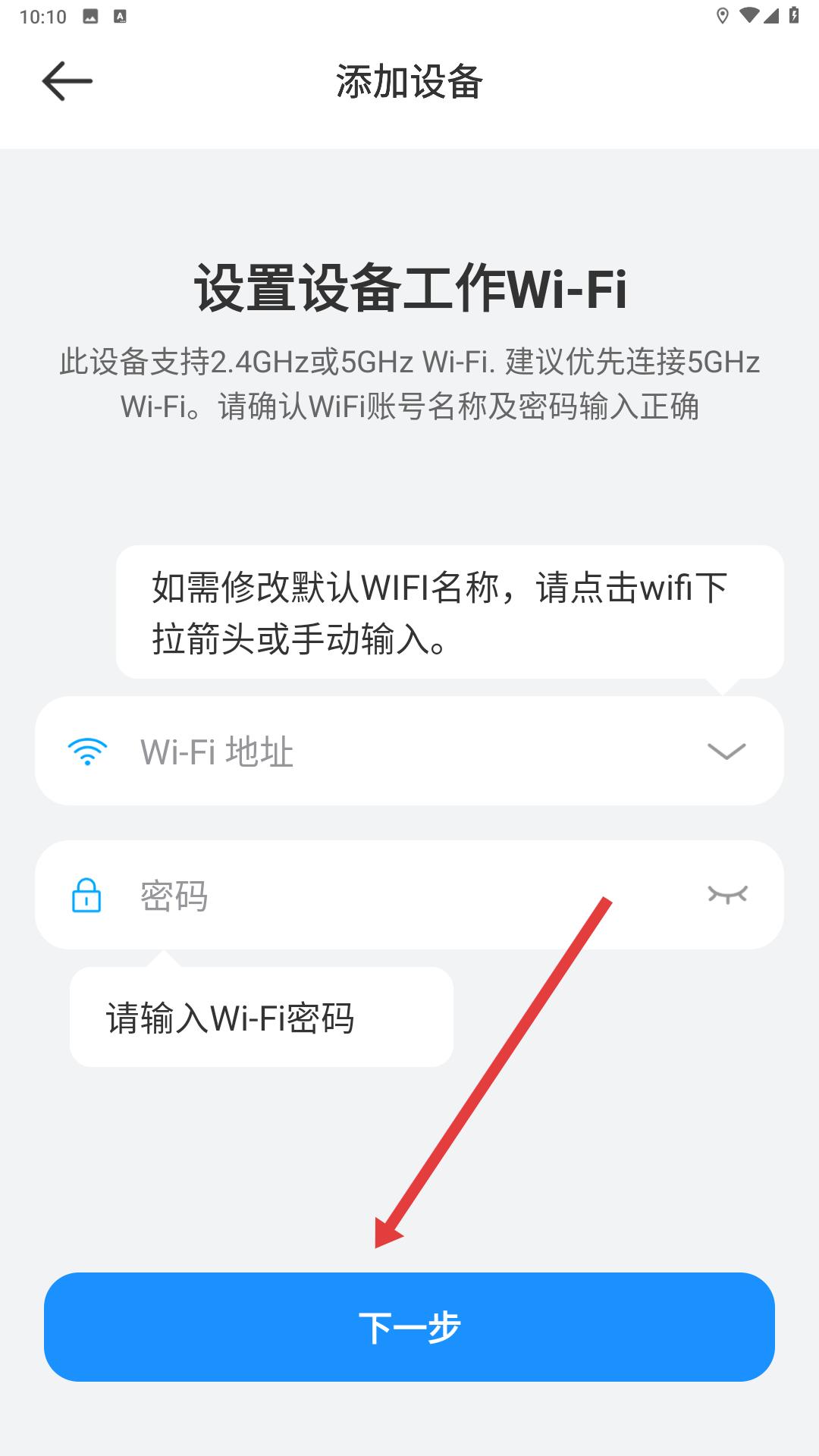 4、設(shè)置設(shè)備工作WiFi界面,輸入WiFi地址和密碼后點(diǎn)擊下一步,可完成設(shè)備的網(wǎng)絡(luò)設(shè)置,進(jìn)而完成設(shè)備添加操作。