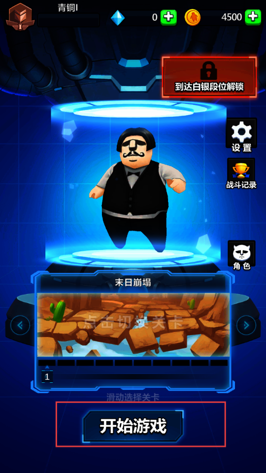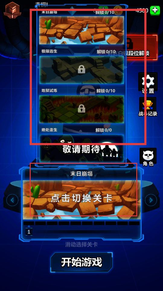 1、點擊開始游戲,選擇關(guān)卡,初始可玩末日崩塌關(guān)卡,其他如極限逃生等關(guān)卡需解鎖后才能選擇,開啟游戲挑戰(zhàn)。
