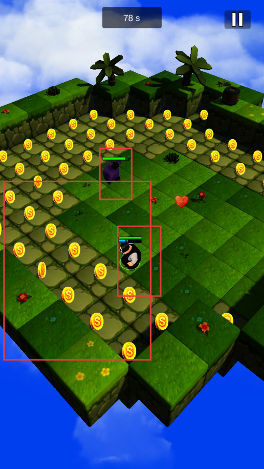 2、進(jìn)入游戲場景,在有金幣、植物的區(qū)域,操控角色移動,收集金幣,同時要留意其他角色,應(yīng)對可能的對抗。