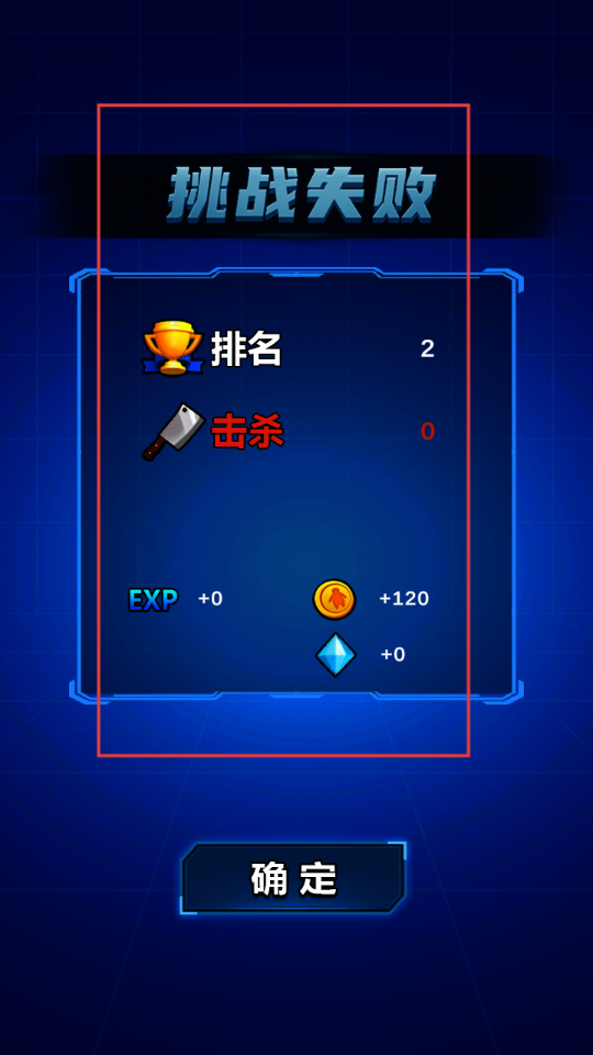 4、若挑戰(zhàn)失敗,會顯示排名、擊殺數(shù)等信息,還能獲得一定金幣獎勵,點擊確定后可重新開始游戲,繼續(xù)挑戰(zhàn)。