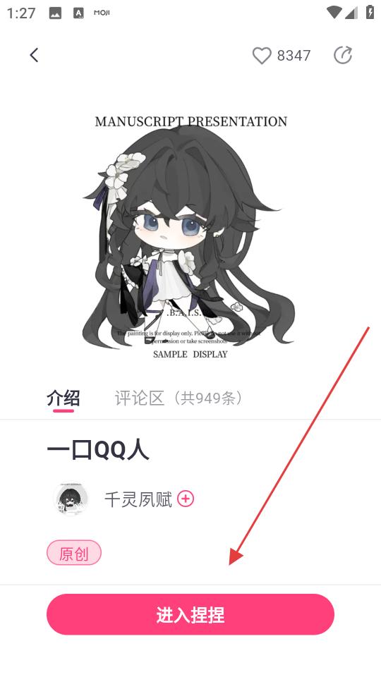 2、在作品詳情界面,查看作品介紹、作者信息等內(nèi)容,界面底部有進(jìn)入捏捏按鈕,點(diǎn)擊該按鈕,跳轉(zhuǎn)至創(chuàng)作捏臉操作頁面。