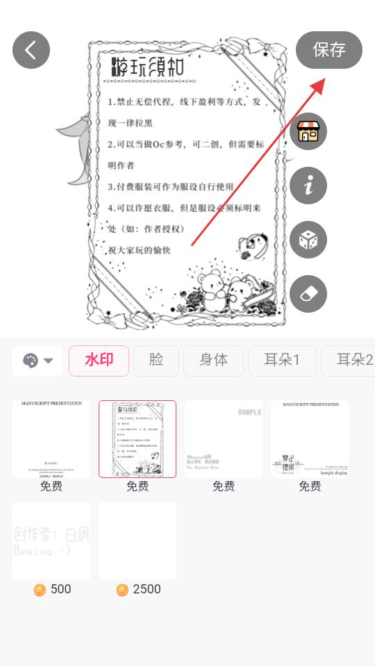 3、在捏臉創(chuàng)作頁面,選擇水印臉身體等不同部件進(jìn)行搭配設(shè)計(jì),完成創(chuàng)作后,點(diǎn)擊界面上方保存按鈕,將設(shè)計(jì)好的內(nèi)容留存,結(jié)束創(chuàng)作流程。