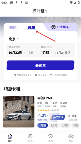2、長(zhǎng)租板塊可選北京提車,展示奔馳E260等車型特惠長(zhǎng)租信息,支持芝麻信用免押金,有2小時(shí)無(wú)責(zé)取消服務(wù),滿足長(zhǎng)租用車需求。