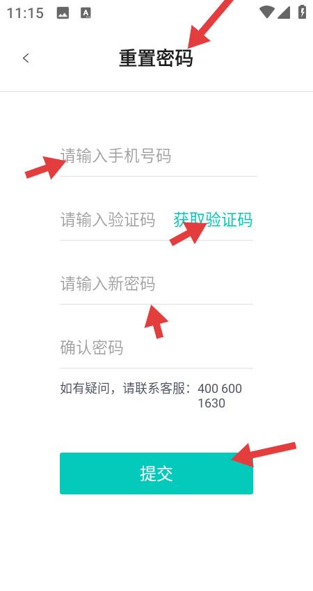 3、重置密碼頁面依次填寫手機號、獲取驗證碼、輸入新密碼并確認,提交后完成密碼重置,如有疑問可聯(lián)系客服,流程規(guī)范保障賬號安全。