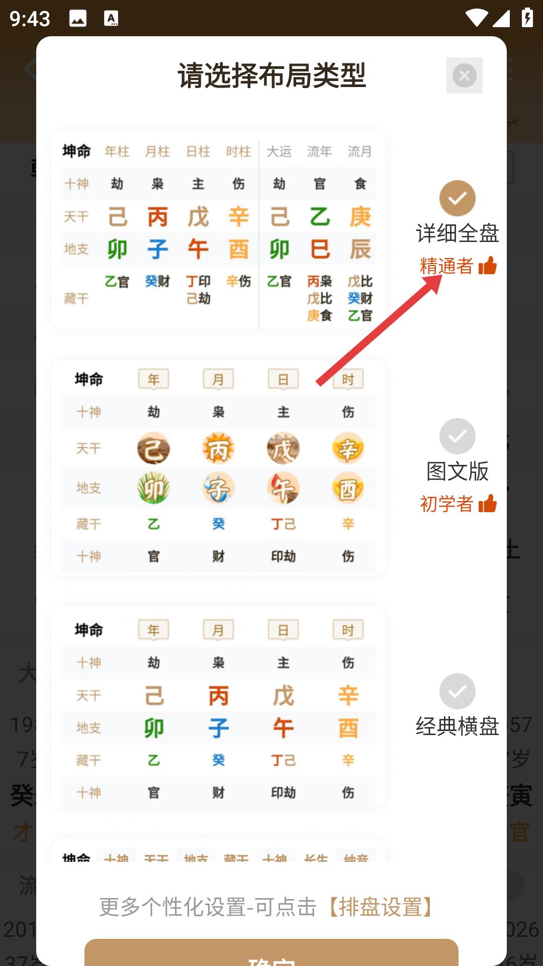 2、在排盤設(shè)置界面,選擇適合自己的布局類型,如詳細(xì)全盤、圖文版或經(jīng)典橫盤,選好后確認(rèn)。