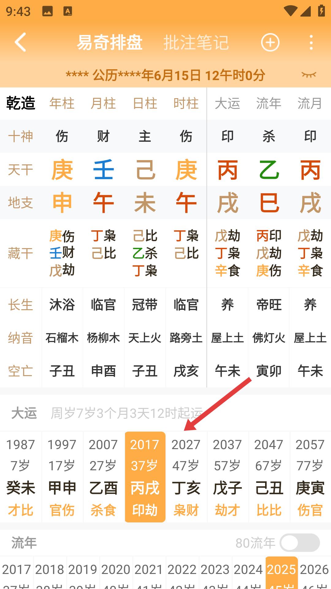 3、進(jìn)入易奇排盤界面,可查看乾造的年柱、月柱、日柱、時(shí)柱等詳細(xì)信息,還能查看大運(yùn)的時(shí)間階段。
