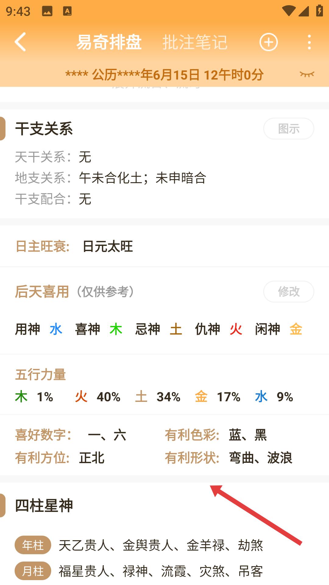 4、在排盤界面下方,可查看干支關(guān)系、日主旺衰、后天喜用、五行力量等信息,也可查看四柱星神的相關(guān)內(nèi)容。