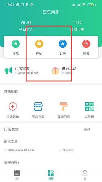 2、功能模塊,商品、評論、財務(wù)、設(shè)置等;快速退單、到店自取等其他功能。