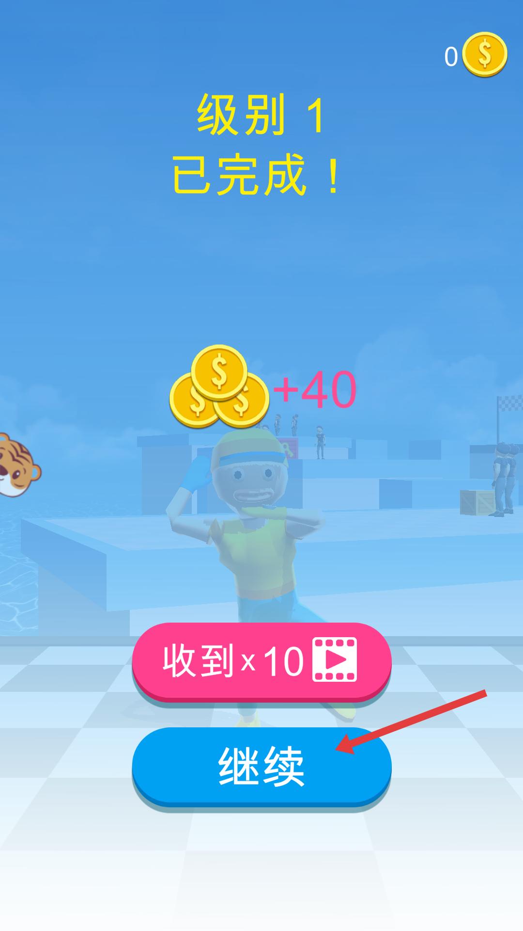 4、級別1完成后,界面會顯示級別1已完成,并獲得金幣獎勵,點擊繼續(xù)按鈕,可進入下一個關(guān)卡,繼續(xù)游戲挑戰(zhàn)。