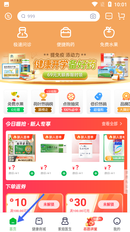 1、首頁(yè)設(shè)有極速問(wèn)診、便捷購(gòu)藥等入口,推健康開(kāi)學(xué)備好藥活動(dòng),有免費(fèi)水果、抽獎(jiǎng)等福利還有新人專享優(yōu)惠。