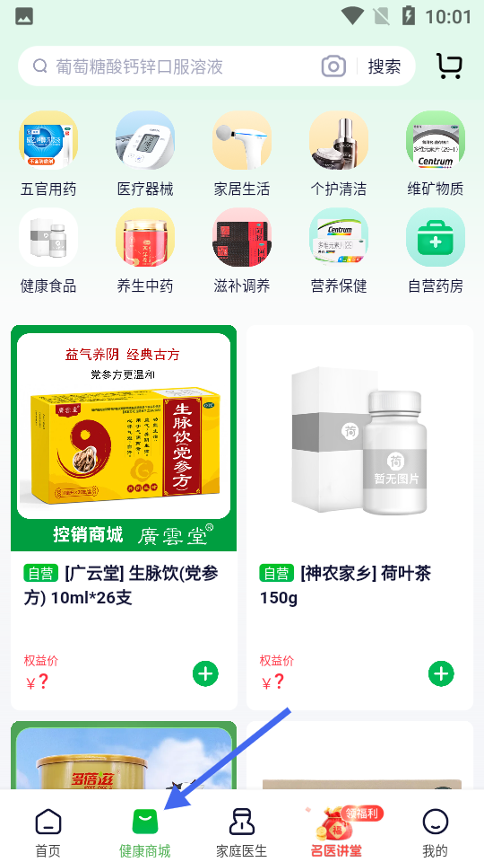 2、健康商城頁(yè)面可搜索藥品及健康產(chǎn)品,分類展示五官用藥、醫(yī)療器械等,呈現(xiàn)生脈飲黨參方等商品及權(quán)益價(jià)。