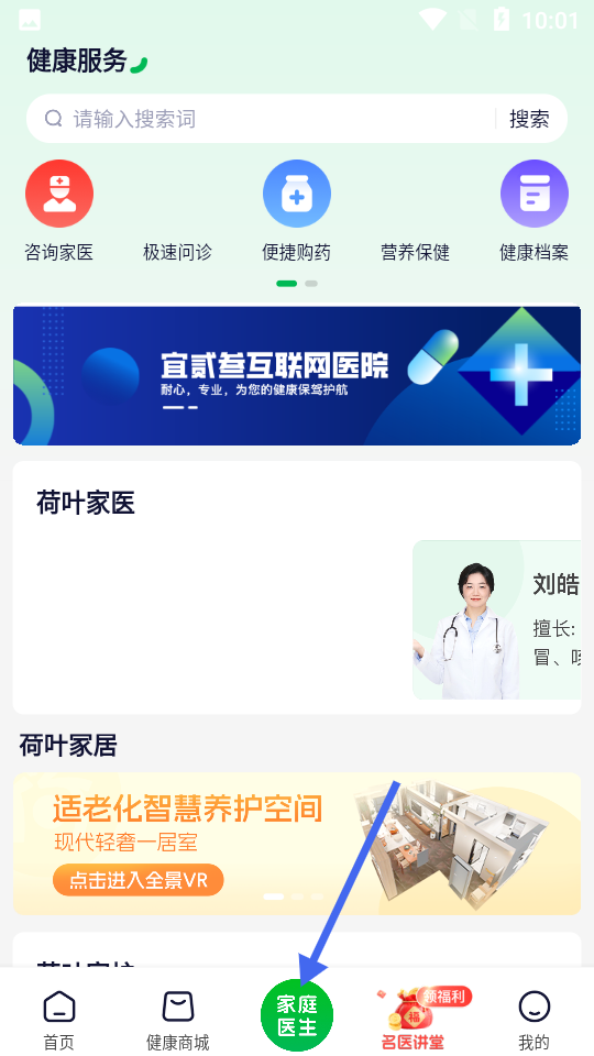 3、家庭醫(yī)生頁(yè)面提供健康服務(wù),有咨詢家醫(yī)、極速問(wèn)診功能,介紹宜貳叁互聯(lián)網(wǎng)醫(yī)院,展示荷葉家醫(yī)信息與適老化養(yǎng)護(hù)空間。
