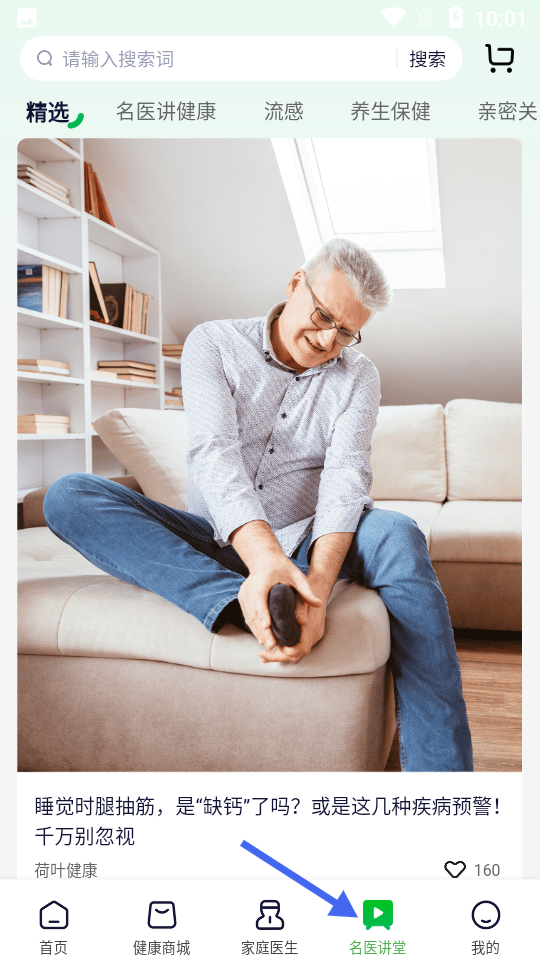 4、名醫(yī)講堂頁(yè)面頂部有搜索欄分精選、名醫(yī)講健康等板塊,展示健康文章,如睡覺(jué)腿抽筋科普內(nèi)容及閱讀點(diǎn)贊數(shù)。