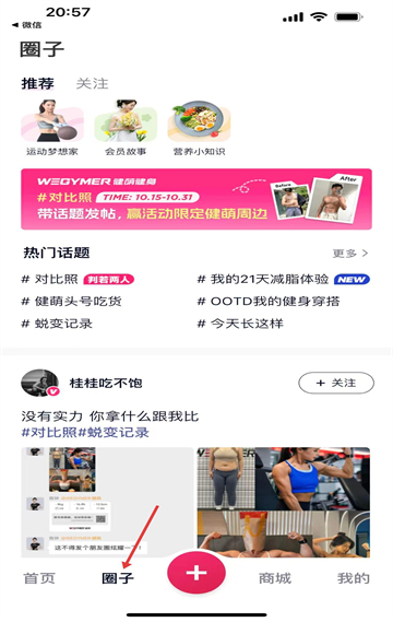 2、圈子板塊有熱門話題和用戶動態(tài),如健身對比照、減脂體驗等,是用戶交流健康生活的平臺互動性強。