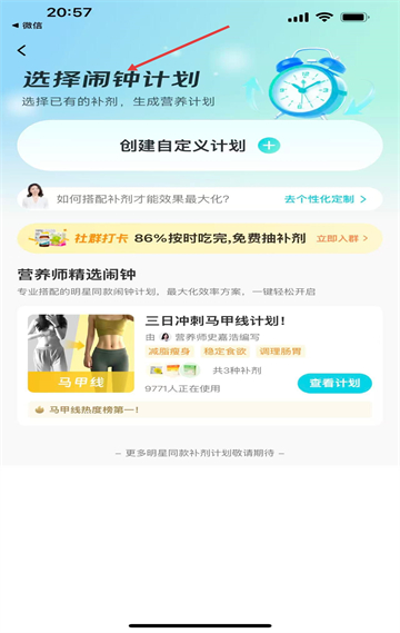 3、鬧鐘計劃板塊可創(chuàng)建自定義營養(yǎng)計劃,有營養(yǎng)師精選方案,如三日沖刺馬甲線計劃,幫助用戶規(guī)律補充營養(yǎng)。