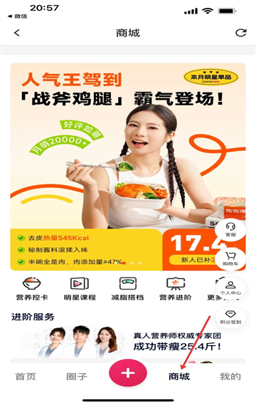 4、商城板塊有戰(zhàn)斧雞腿等健康食品,還有營養(yǎng)控卡、明星課程等服務(wù),滿足用戶健康消費需求品類多樣。
