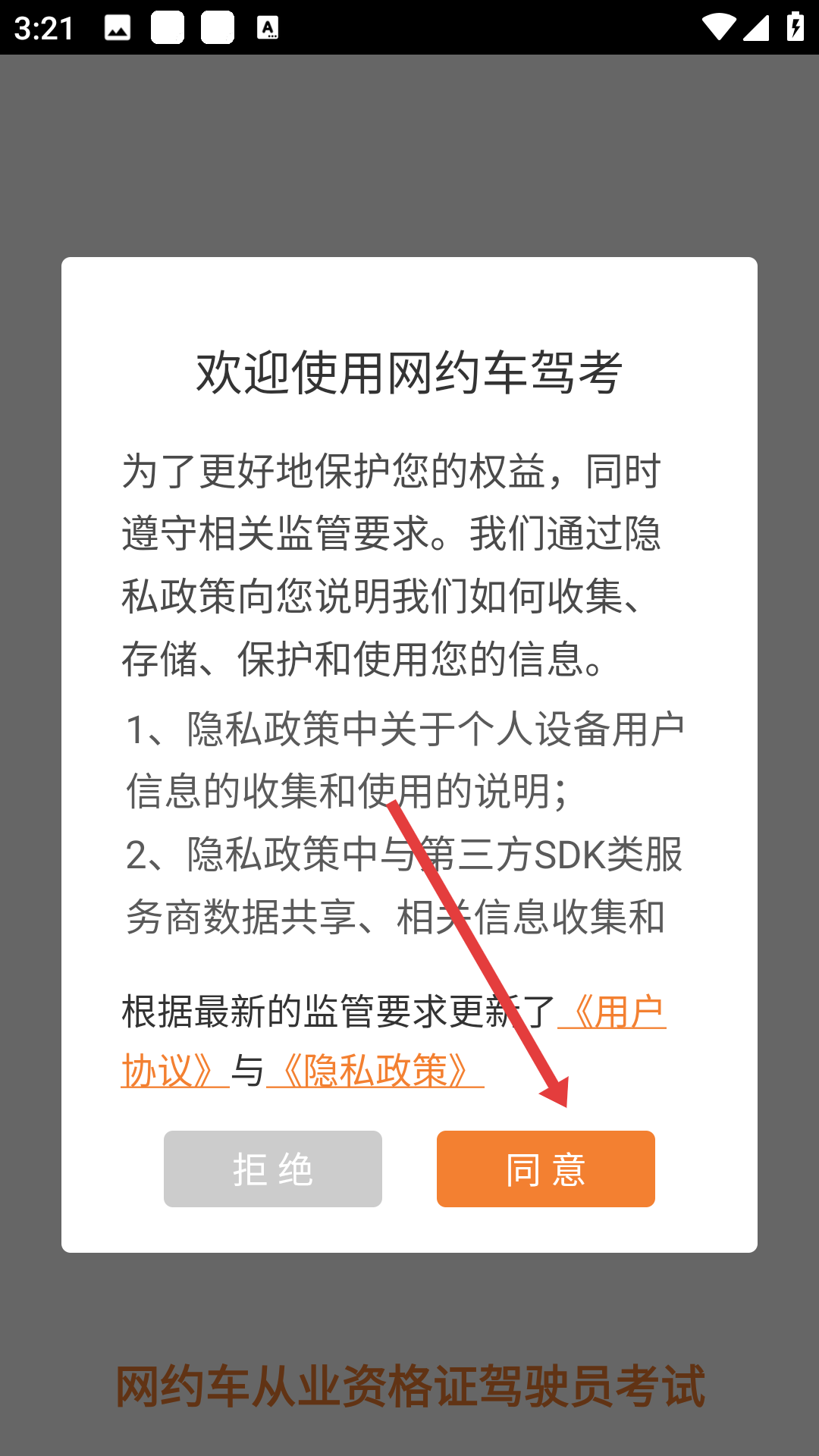 1、使用網約車駕考軟件前,需在隱私政策提示界面點擊同意,以遵循監(jiān)管要求并保護自身權益。