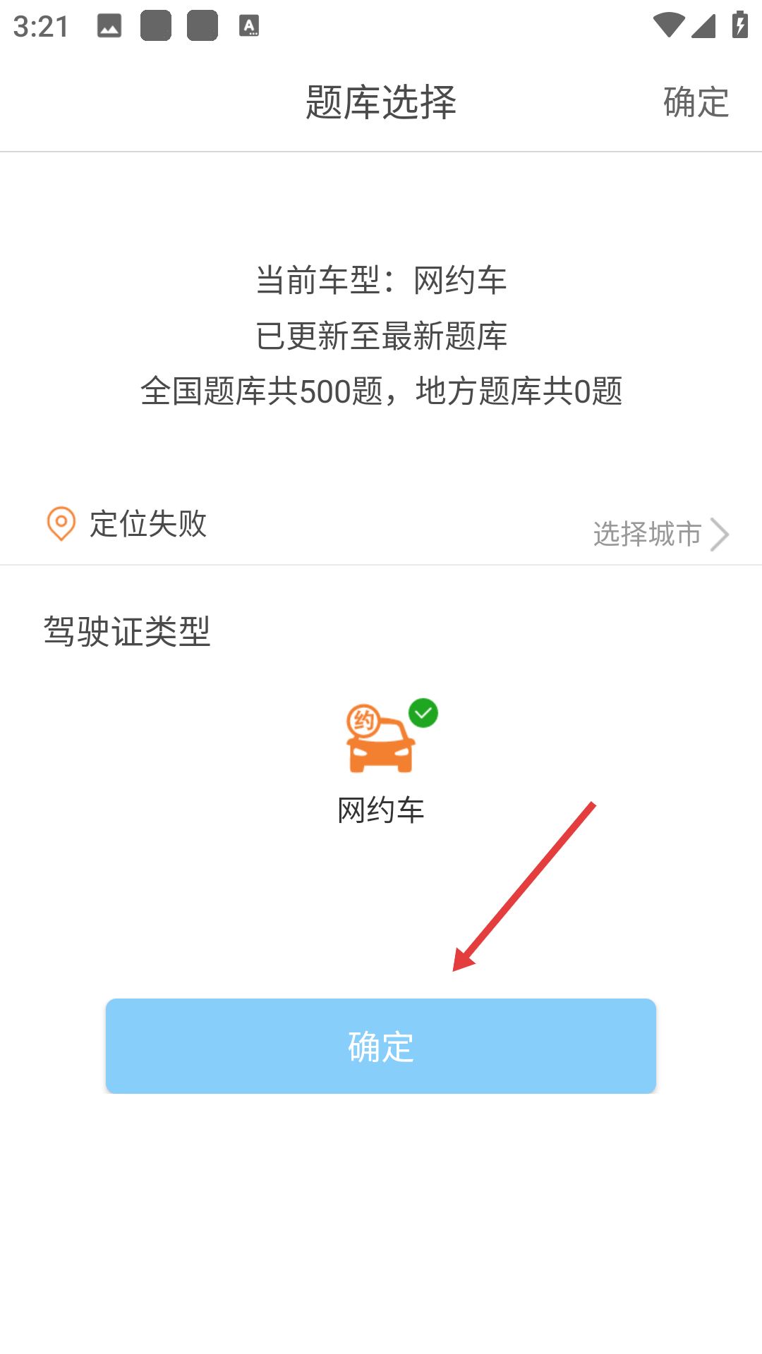 2、在題庫選擇頁面,可確認當前車型為網約車,全國題庫有500題,定位失敗時也能手動選擇城市,點擊確定即可進入練習。