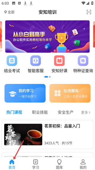 2、在首頁借多樣服務,參與課程學習,使用在線題庫,借智能客服,解決學習疑問,助力技能成長。
