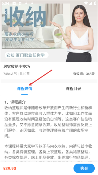 3、課程頁面介紹收納整理師行業(yè)及課程內容,涵蓋各類物品收納,課程共10節(jié),有效期365天,售價39.90元。
