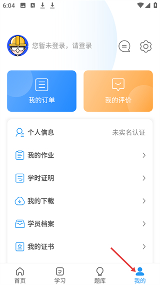 4、我的頁面,顯示暫未登錄,有我的訂單、我的評價等功能,可查看個人信息、作業(yè)、學時證明等,個人信息未實名認證。