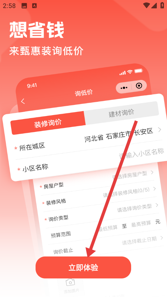 2、進入會看到想省錢來甄惠裝詢低價的引導(dǎo)頁面,展示了裝修詢價等功能入口,點擊立即體驗可進入具體功能操作界面。
