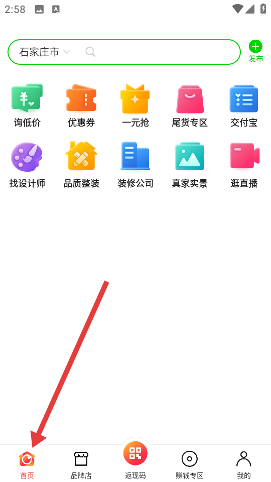 3、進入首頁能看到詢低價、優(yōu)惠券、一元搶等眾多功能圖標,涵蓋裝修各個方面服務(wù),底部導(dǎo)航欄有首頁、品牌店、返現(xiàn)碼、賺錢專區(qū)、我的等選項。