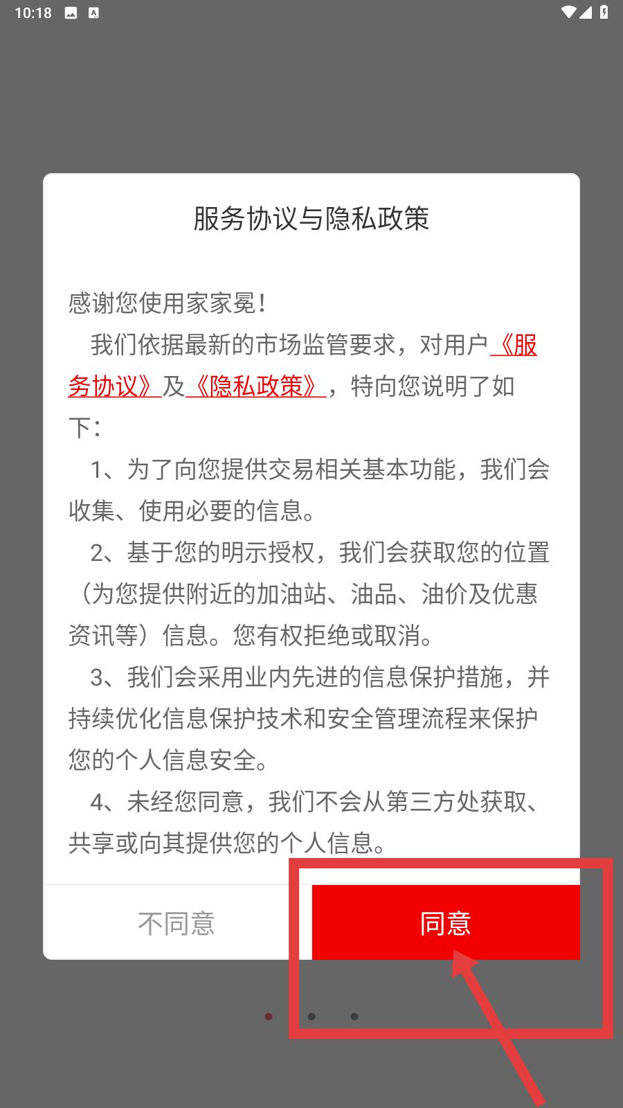 1、打開家家冕應(yīng)用,彈出服務(wù)協(xié)議與隱私政策彈窗,仔細(xì)閱讀內(nèi)容,明確服務(wù)與信息規(guī)則,點(diǎn)擊同意按鈕,進(jìn)入登錄頁面。