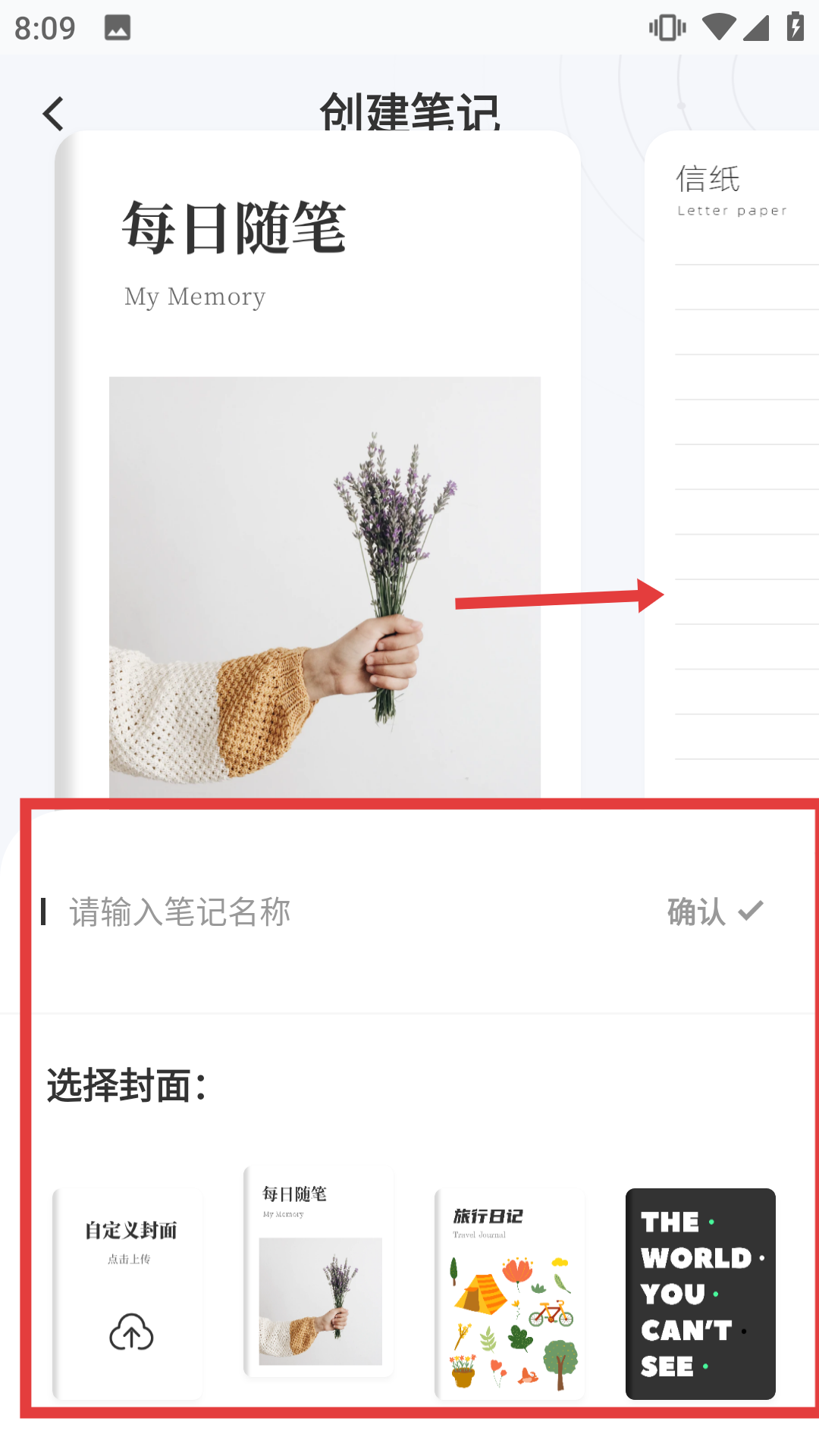 2、進入創(chuàng)建筆記頁面,輸入筆記名稱并確認,選擇喜歡的封面,如每日隨筆、旅行日記等,完成筆記的基礎設置。