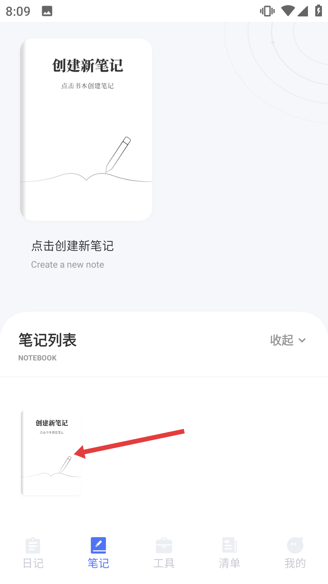 1、打開小小記錄軟件,然后進入筆記頁面,點擊創(chuàng)建新筆記的書本圖標,開始創(chuàng)建新的筆記,開啟筆記記錄之旅。