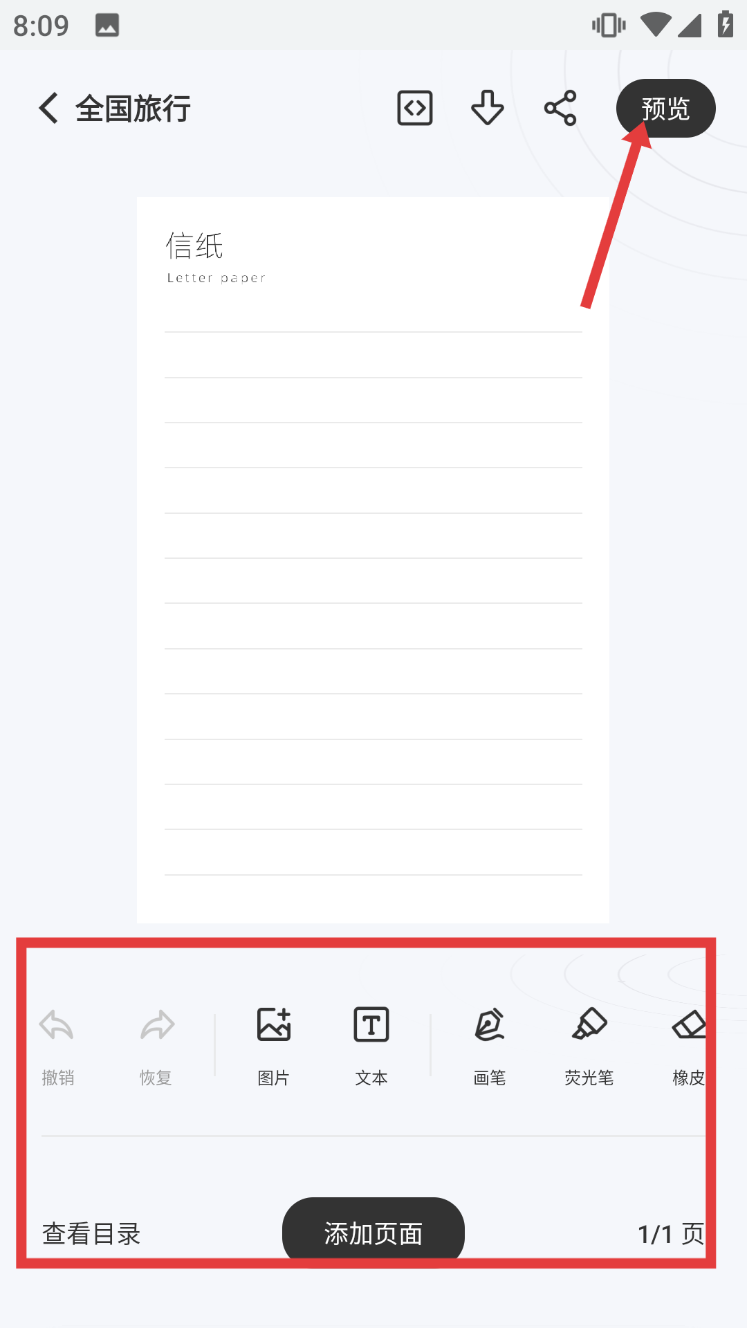 3、在筆記編輯頁面,可使用圖片、文本、畫筆等工具編輯內(nèi)容,用戶還可添加頁面,編輯完成后點擊預覽按鈕查看筆記效果。