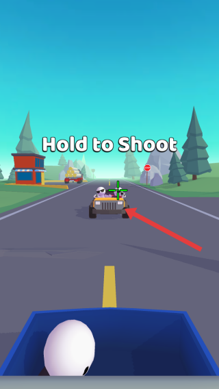 1、游戲開始公路場景中,看到前方有目標(biāo)車輛,按照HoldtoShoot的提示,長按進(jìn)行射擊操作。