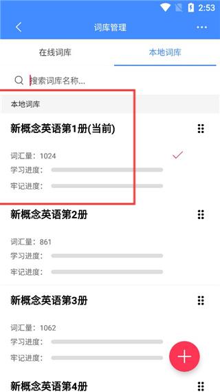 3、下載成功后就可以在本地詞庫看到了點擊該頁面右下角的加號,可以在這里選擇新建其他詞庫,多方面的滿足你的學(xué)習(xí)要求。