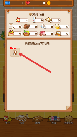 2、點擊制作后,會彈出所持物品界面,顯示面粉、牛奶等食材數(shù)量,還有帶New標識的問號選項,可選擇要制作的面包。