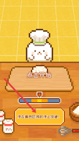 3、開始制作時,界面有點擊開始提示,下方進度條需停到黃區(qū)域時停止按鍵,按提示操作來制作面團。