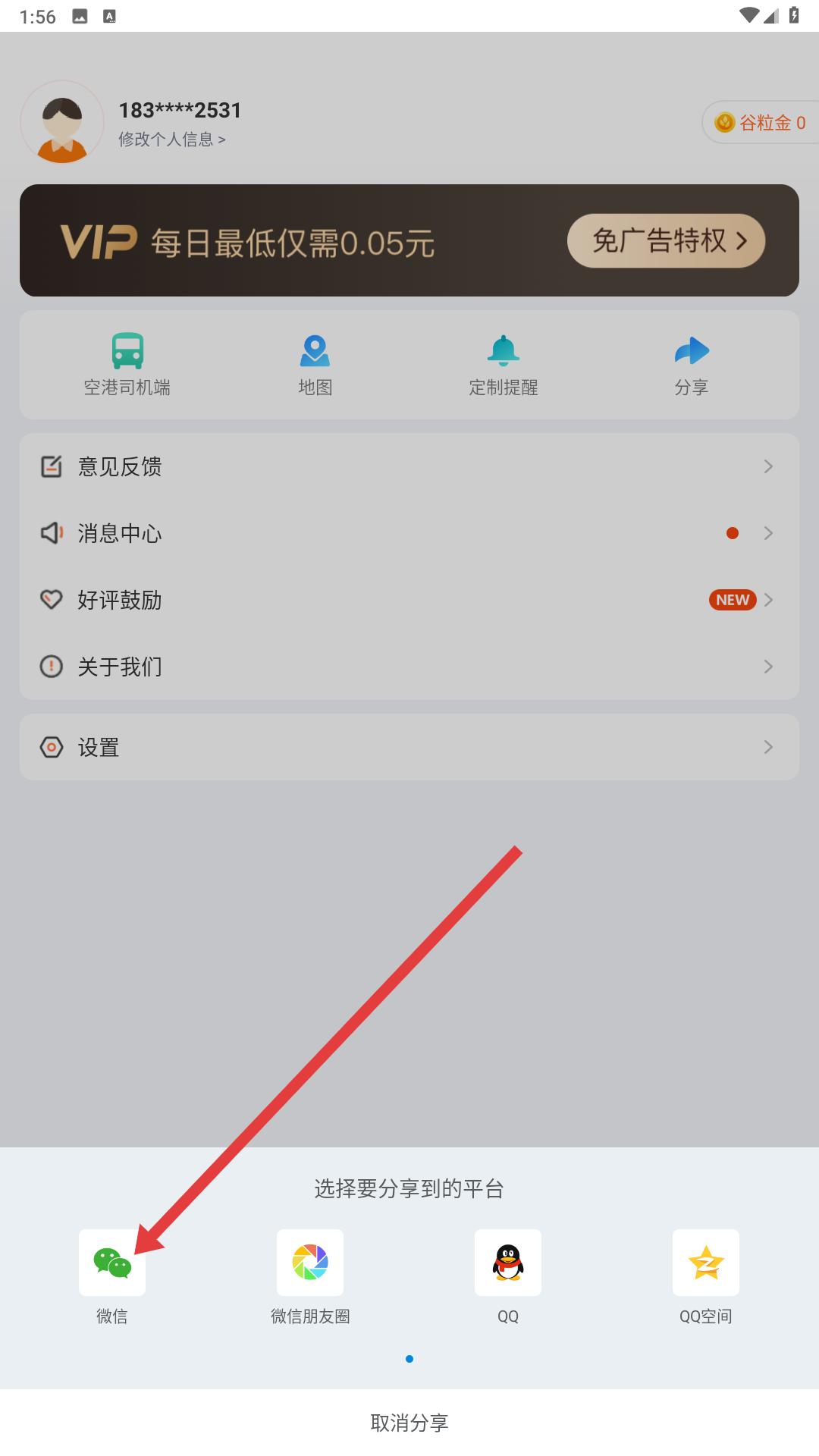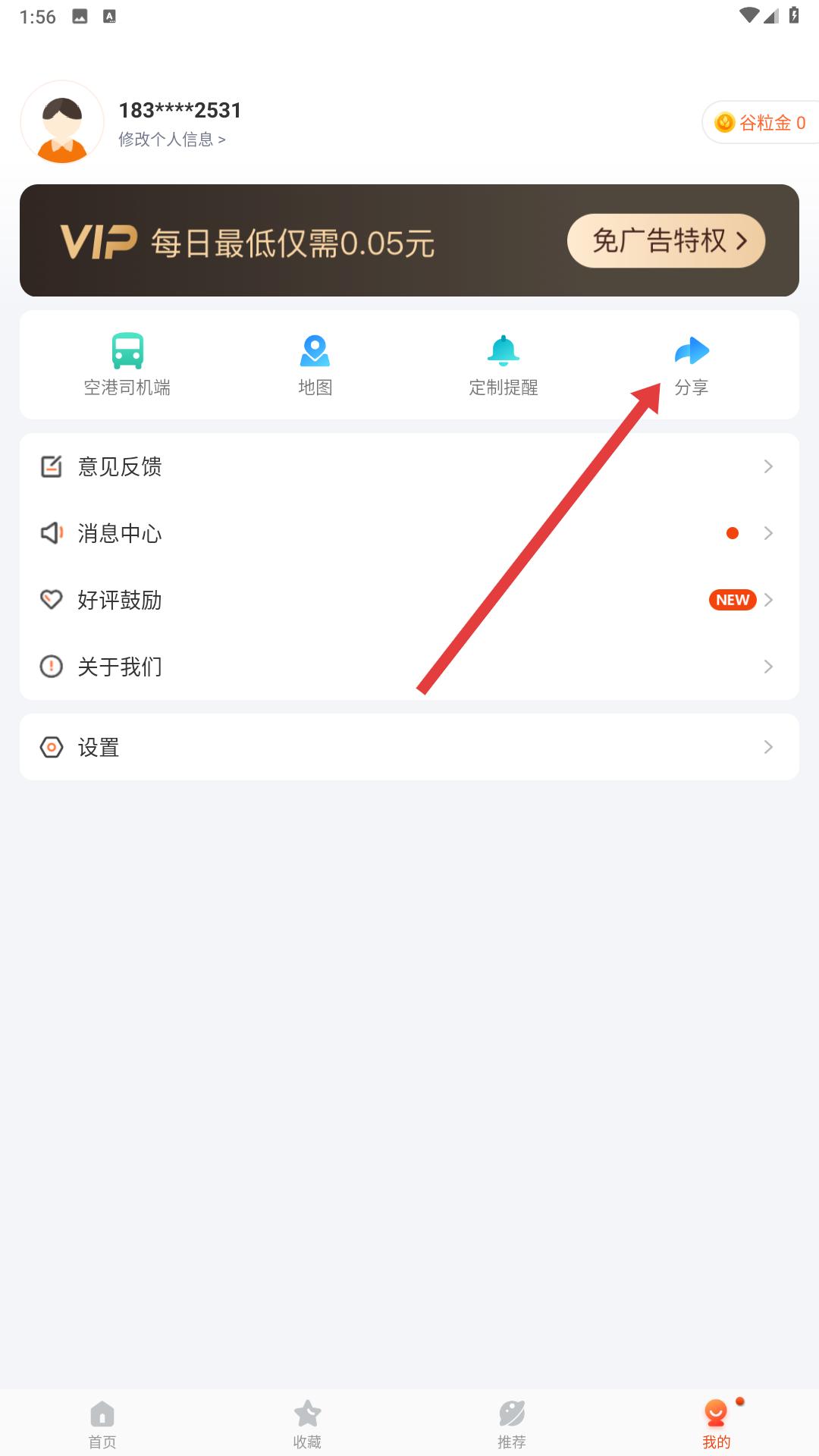 2、我的頁面,能看到個(gè)人賬號信息,還有空港司機(jī)端、地圖等功能入口,若想把應(yīng)用分享給他人,點(diǎn)擊分享按鈕就行。