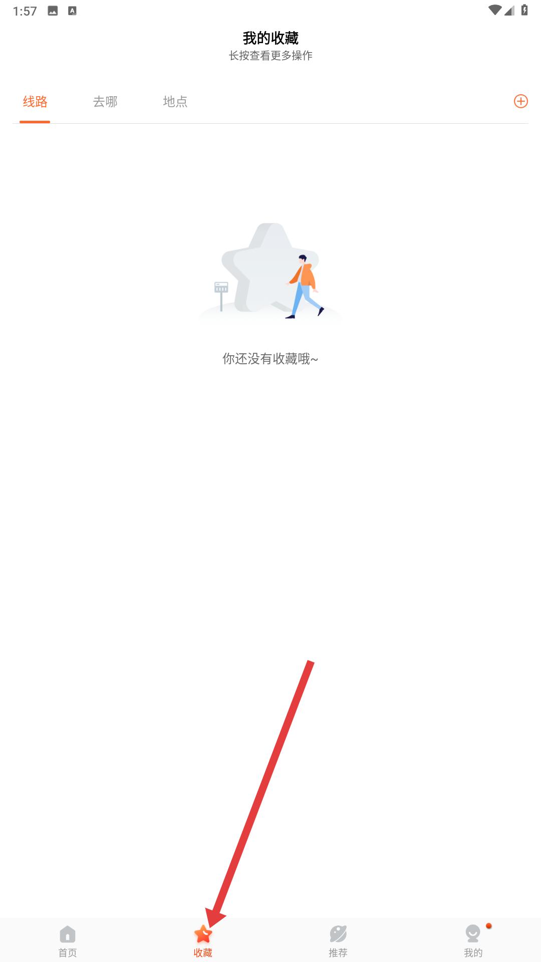 4、應(yīng)用底部,有首頁、收藏等導(dǎo)航欄,點(diǎn)擊收藏,可進(jìn)入我的收藏頁面,能查看收藏的線路、地點(diǎn)等,方便后續(xù)快速查找。