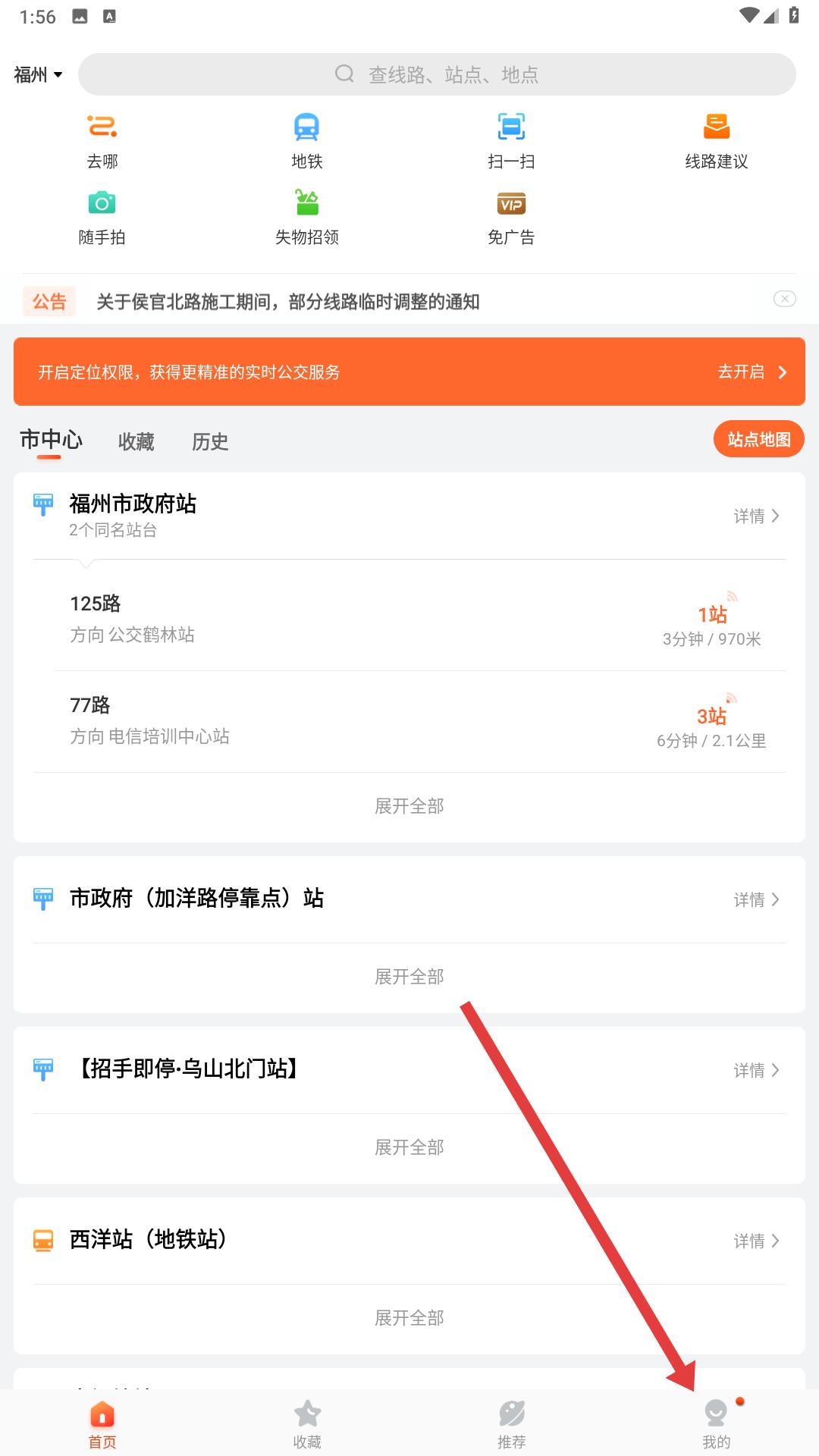 1、進(jìn)入掌上公交首頁,能看到去哪、地鐵等功能按鈕,還有福州市政站等站點(diǎn)及對應(yīng)公交信息,若想查看個(gè)人相關(guān),點(diǎn)擊我的即可。